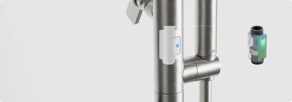 A shower-powered turbine generates energy from water flow alone and powers hai’s internal Bluetooth.